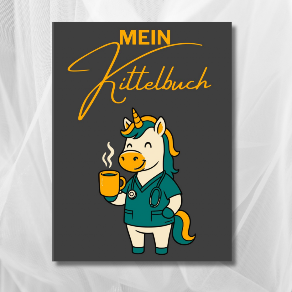 Dieses Kittelbuch verbindet Pflege und Verspieltheit. Das Einhorn mit Stethoskop steht für Engagement, Freundlichkeit und einen positiven Blick auf den Pflegealltag.