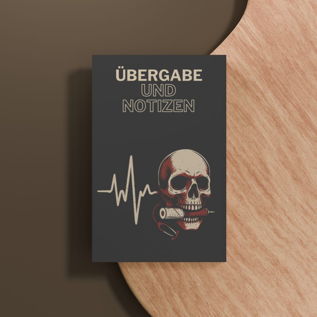 Mit diesem Übergabebuch im Skull-Design zeigst du: Pflege ist kein Ponyhof. Zwischen EKG-Kurven, schwarzem Humor und tiefschwarzem Kaffee finden hier alle deine Notizen, Übergaben und Gedanken Platz – stylisch, praktisch, kompromisslos.